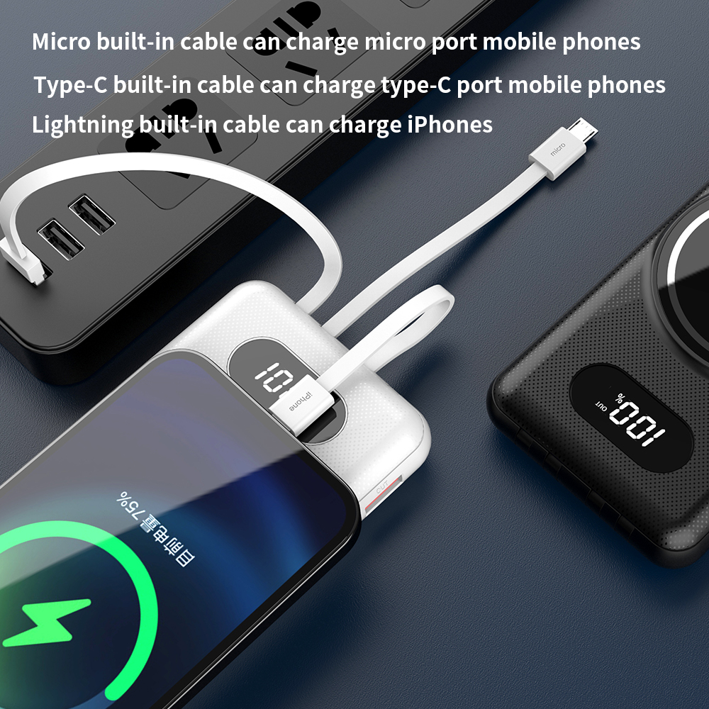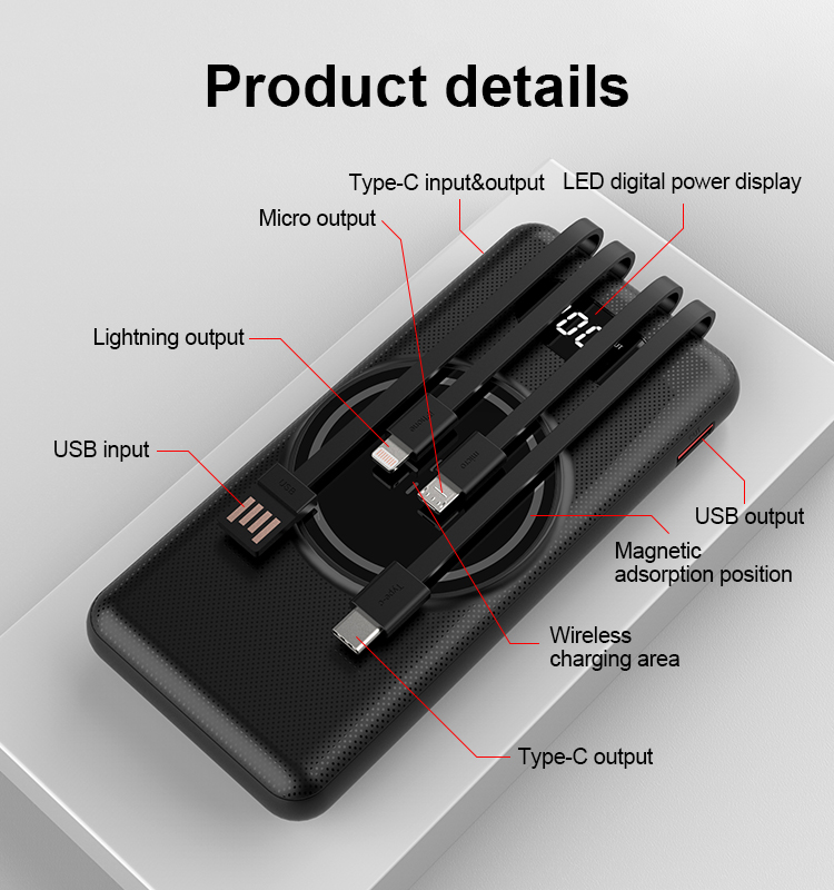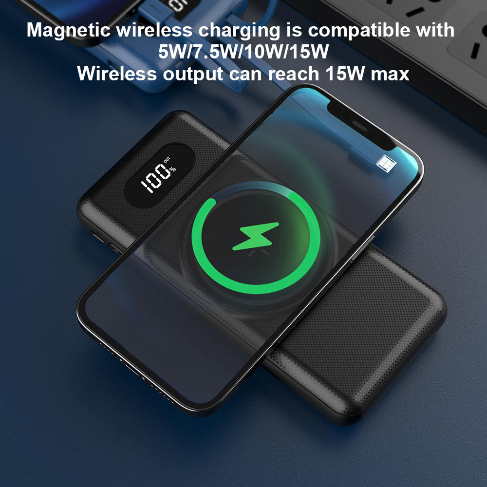- Product description:22.5W PD Quick Charge +15W 10000mAh digital display magnetic suction Wireless charge Mobile power supply +4 built-in cables